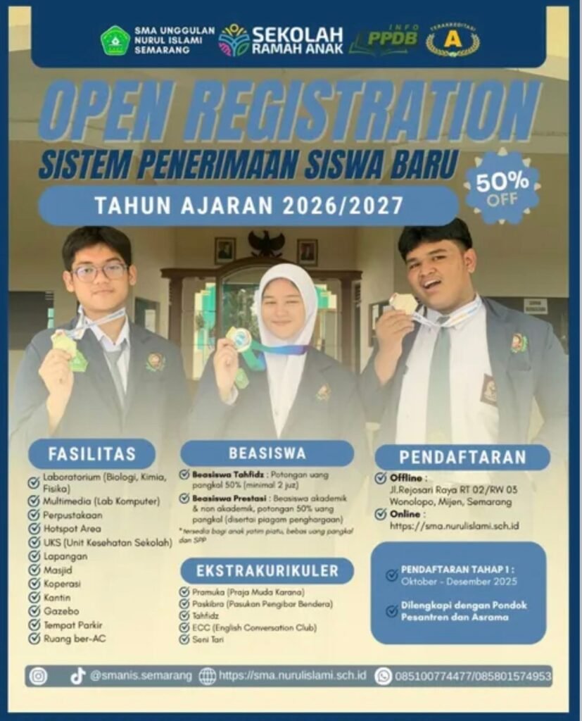 Selamat datang di halaman Sistem Penerimaan Murid Baru (SPMB) Tahun Akademik 2026/2027 SMA Unggulan Nurul Islami Semarang. Silakan isi formulir pendaftaran dengan data yang benar dan lengkap sesuai dengan petunjuk yang diberikan.
